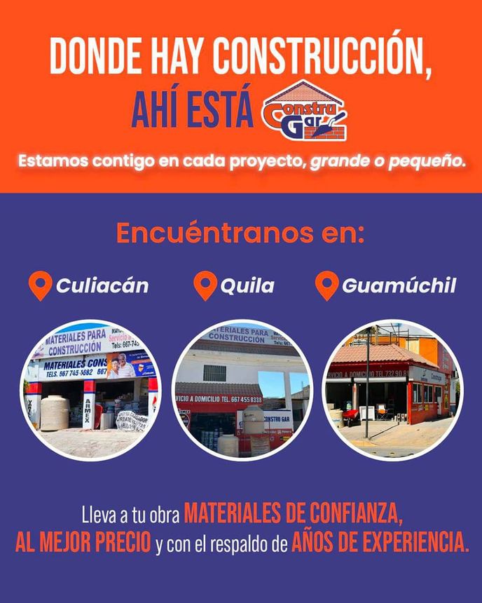 CONSTRUGAR es una empresa especializada en la venta de materiales para construcción en Culiacán, Guamúchil y Quilá, Sinaloa con experiencia ofreciendo productos de la más alta calidad para obras residenciales, comerciales e industriales.